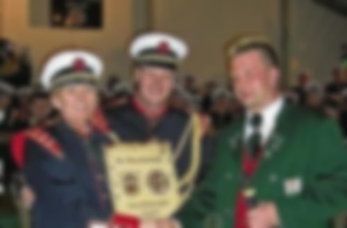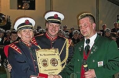 2008 | Auf dem Hof Fehrmann lädt der Verein zu einem musikalischen Frühshoppen ein. Das 50-jährige Bestehen des Vereins wird in großem Rahmen gefeiert: Kommersabend mit Ehemaligentreffen und Sternmarsch mit vielen Gastvereinen. Eine neue Uniform wird präsentiert. Der befreundete Musikverein Aub ist ebenfalls zu Gast. Das Bild zeigt rechts ihren 1. Vorsitzenden Michael Ebner. ![]() In Rastede holt der Verein den Gesamtsieg und darf sich „European Champion“ nennen. ![]() |